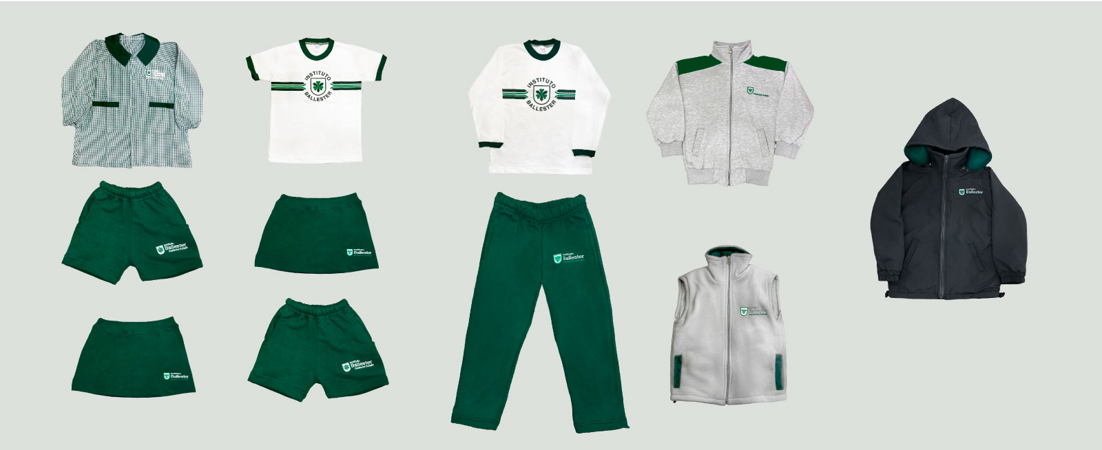 Guardapolvo cuadrillé verde y blanco | Remera (manga corta / larga) con logo IB | Chaleco gris de polar con logo IB | Calza o pollera pantalón verde / Pantalón corto verde con logo IB | Pantalón largo de frisa verde con logo IB | Campera de frisa gris y verde con logo IB | Zapatillas blancas | Medias blancas | Campera de abrigo de microfibra y polar con logo IB